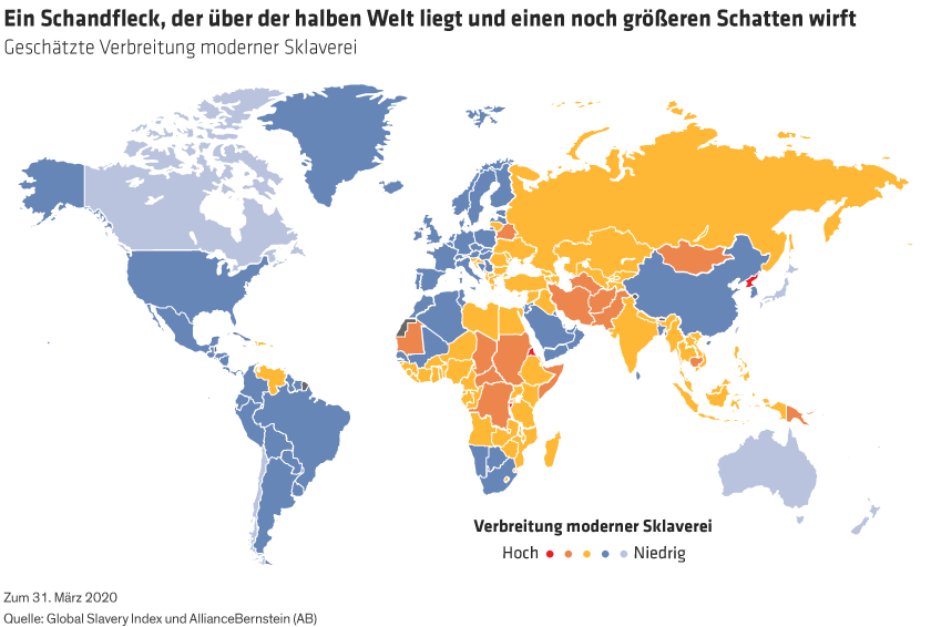 Um eine korrekte Analyse durchzuführen, müssen die Anleger die Länder und Branchen im Ganzen bewerten, aber auch einen korrigierenden Zoom auf alle Aspekte der Geschäftsmodelle und Lieferketten legen – die Verbindungen zur modernen Sklaverei können nämlich komplex sein und im Verborgenen liegen.