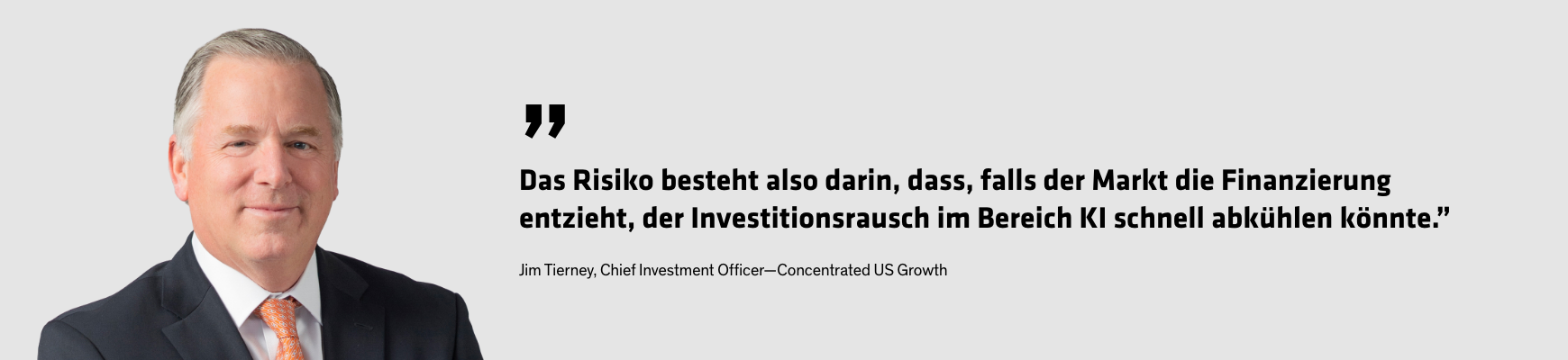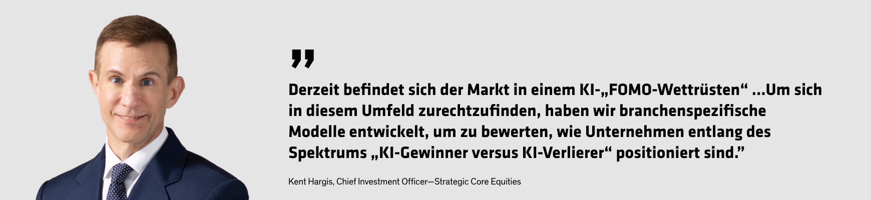 Kent: In jeder Blase übertreffen spekulative und qualitativ schwächere Unternehmen kurzfristig häufig den Markt. Doch da sich spekulative Exzesse in Teilen des KI-Ökosystems weiter aufbauen, ist es umso wichtiger, diszipliniert zu bleiben und sich auf Qualität zu konzentrieren. Ich halte den effektivsten langfristigen Ansatz für den, Unternehmen zu identifizieren, die sowohl ein erhebliches Aufwärtspotenzial durch ihre KI-Exponierung als auch eine Risikominderung durch starke Fundamentaldaten in ihren Kerngeschäften bieten. Bei jeder Investition besteht ein Risiko – insbesondere bei einer sich so rasant entwickelnden Wachstumsstory wie KI – doch das Ziel unserer Strategie besteht darin, attraktive risikobereinigte Erträge zu erzielen und gleichzeitig das Abwärtsrisiko zu minimieren. Das bedeutet, in widerstandsfähige, qualitativ hochwertige Unternehmen zu investieren, die in der Lage sind, ihren Wert über die Zeit zu steigern, anstatt den kurzfristigen Gewinnen spekulativer KI-Geschichten nachzujagen.