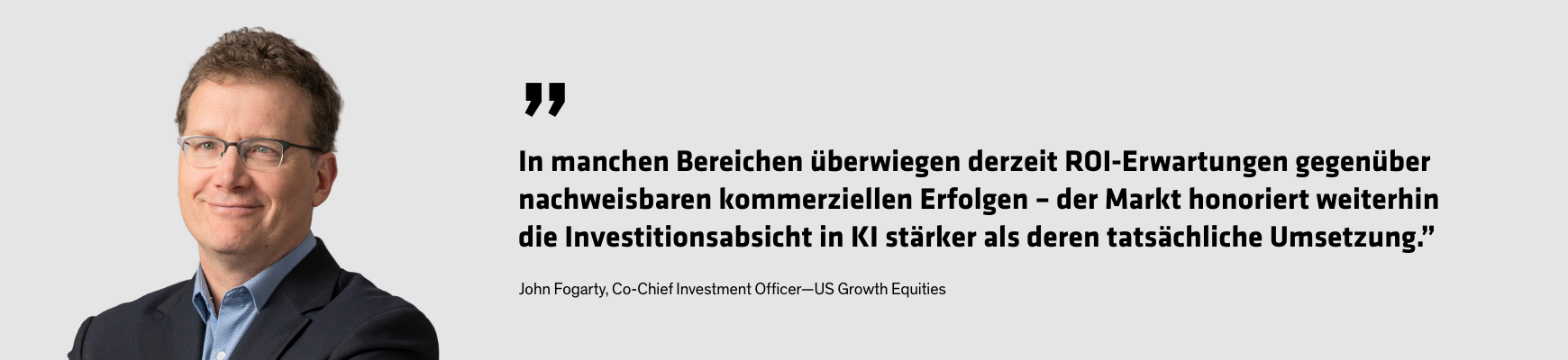 John: Es gibt deutliche Unterschiede zwischen diesem Infrastrukturaufbau und dem Ausbau des Telekommunikationsinternets um das Jahr 2000, insbesondere eine bislang geringere Fremdfinanzierung sowie die Tatsache, dass derzeit eine unmittelbare Nachfrage bedient wird, im Gegensatz zum damaligen Ausbau der „Dark Fiber“. Dennoch hat sich die Investitionsintensität im Verhältnis zum aktuellen Umsatz bei den Hyperscalern, ähnlich wie beim Internetboom, verdoppelt. Investitionszyklen erreichen ihren Höhepunkt, ebenso wie die entsprechenden Bewertungen, unabhängig davon, ob die Ausgaben anschließend langsam oder stark zurückgehen. Blickt man über das Ende dieser frühen Infrastrukturphase hinaus, ähnlich wie in der späteren Dotcom-Ära, halte ich es für wahrscheinlich, dass die Unternehmen, die von der praktischen Anwendung der KI profitieren, noch nicht als Marktführer hervorgetreten sind. Die Identifizierung dieser Anwender wird Alpha generieren, unabhängig von Dauer und Rendite des Ausbaus.