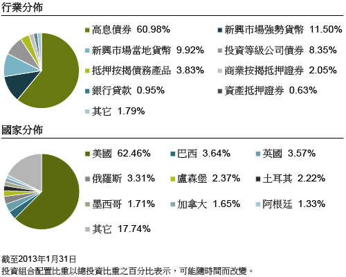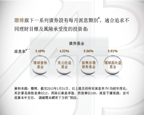 ^^以上提及的所有派息率(%)均經年度化。其計算是將股息乘以12,再除以資產淨值,然後乘以100。派息不獲保證,並可從資本中支付。正數派息率並不代表正數回報。派息率只作參考之用,並不代表基金的真正回報,亦不代表投資者可獲分派之息率。派息率並沒有計算本基金之資產淨值變化。所有基金均以美元AT類股份計算。 聯博–環球債券基金歷年回報為-3.3%(2008),12.6%(2009), 6.8%(2010),1.8%(2011),3.0%(2012),-0.4%(2013年初至今); 聯博- 美元收益基金歷年回報為-11.3%(2008),25.0%(2009),10.4% (2010),5.9% (2011),9.4% (2012) 及 -0.2% (2013年初至今); 聯博–新興市場債券基金歷年回報為-19.7%(2008), 44.3%(2009), 12.1%(2010), 4.7%(2011), 19.0%(2012), -1.2%(2013年初至今); 聯博 - 環球高收益基金歷年回報為-32.3% (2008),60.6% (2009), 15.6% (2010), 0.2% (2011), 16.3% (2012), 1.1%(2013年初至今); 按資產淨值比資產淨值計算,股息用於再投資,以美元計算。資料來源:聯博,截至2013年1月31日。