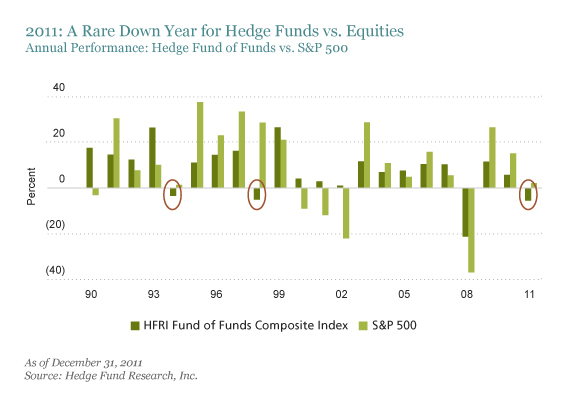 The HFRI Fund of Funds Composite Index, the most commonly used broad measure for funds of funds and a good gauge of the overall industry, ended 2011 with a 5.6% loss, underperforming the S&P 500 Index’s 2.1% gain. The last time the composite underperformed the stock market was 1998—the year that the largest existing hedge fund, Long-Term Capital Management, failed. Hedge funds also lagged the market in 1994 , as the display shows.