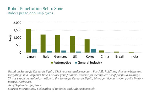 These technological breakthroughs are all happening as rapid industrial growth in developing countries is starting to drive up the low labor costs that have propelled Asian and Latin American economies. Populations are ageing more rapidly—and not just in developed countries. China must soon confront the implications of its one-child policy on economic growth. Fewer and more expensive economically active members of the population will make labor-intensive manufacturing increasingly less economical. And in many emerging economies, the penetration of robots in industrial sectors is far behind developed markets (Display).