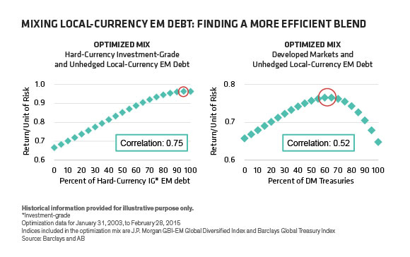 We think there’s another way to tweak the mix that does better—one with even less credit risk and a more pure form of interest-rate duration to diversify away the growth factor in EM local-currency bonds. Why not consider developed-market government bonds? It’s hard to find a purer source of interest-rate risk. As the optimization in the Display, right, suggests, when unhedged EM local-currency bonds are blended with unhedged DM government bonds, the portfolio diversification benefits are quite significant, because EM and DM are less correlated.