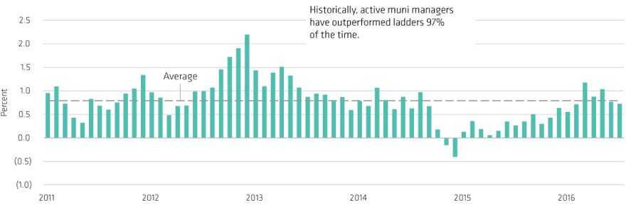 Year after year, passive muni investors lose out on yield and return. Since 2009, the average active municipal bond manager has outperformed passively managed municipal ladders (Display) in an astounding 97% of two-year rolling periods—and by an average of nearly 80 basis points.