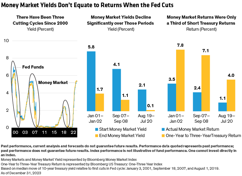 On the flip side, investors who stay in money markets could see a rapid drop in cash yields, which have been nearly perfectly correlated with the fed funds rate—and the Fed tends to ease fast. That’s what happened in the last three rate-cut cycles (Display), and money markets ended up returning only one-third as much as short-term Treasury bonds. Given consensus expectations for a sizable decline in the fed funds rate, that’s a looming risk for cash.