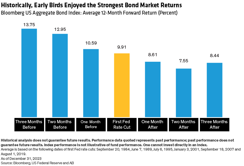 To capitalize, we think investors should consider switching from cash to bonds now, because government bond yields often fall and prices rise before the Fed moves.