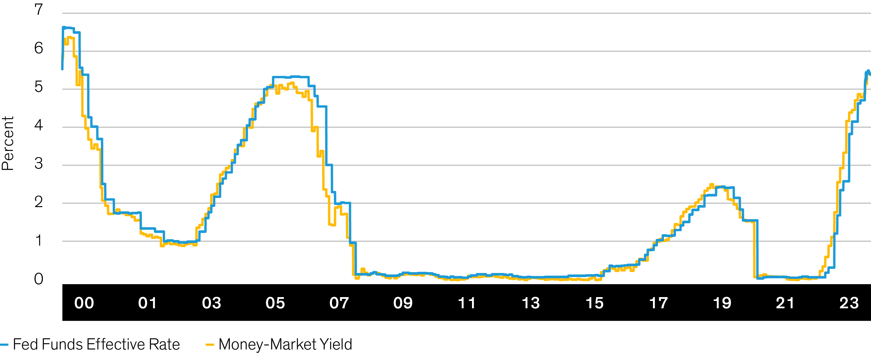 The fed funds rate and money-market yields are almost perfectly correlated. When the Fed cuts rates, money-market yields tend to follow suit—nearly instantaneously.