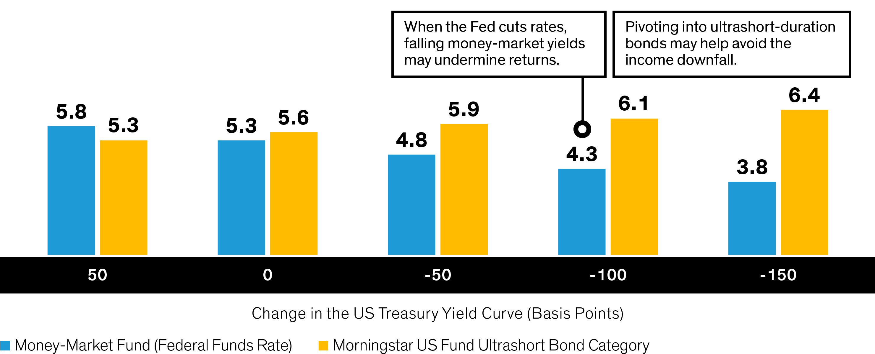 *Shock analysis assumes the potential impact of an instantaneous parallel shift (across the whole curve) in US Treasury yields and the resultant yield over the next 12 months. Utilizes the Effective Federal Funds Rate for Money-Market Fund yield: 5.33 and the Morningstar US Fund Ultrashort Bond category average yield and duration: 5.60% and 0.54 years, respectively. Duration is a measurement of the sensitivity of a security to changes in interest rates. Analysis ignores correlations between Treasuries and other sectors that the portfolio invests in. The actual moves in spreads and Treasury yields may differ meaningfully from the sample moves shown.