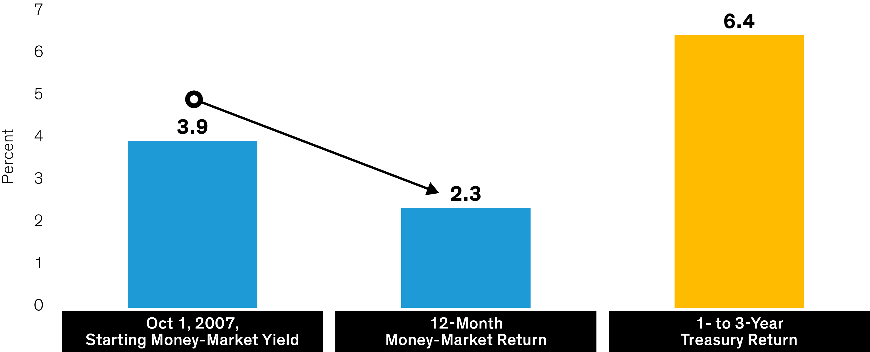 From October 2007 to October 2008, money-market yields plummeted from 3.9% to 1.1% as the Fed began cutting interest rates. Over that period, money-market investors earned only 2.3%, while short-term Treasuries returned 6.4%.