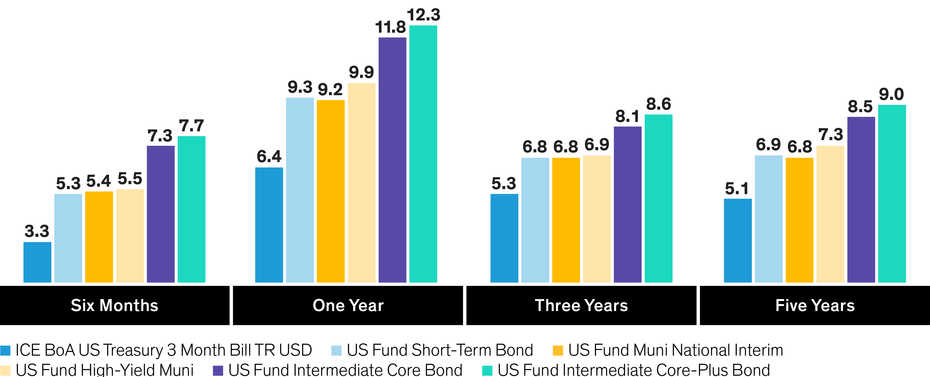 Data represents category average returns for the six-month, one-year, three-year, and five-year periods following Fed rate-hike pauses on the following dates: September 1, 1984, October 1, 1987, March 1, 1989, March 1, 1995, June 1, 2000, July 1, 2006, and January 1, 2019. Bond categories are represented by Morningstar Mutual Fund category averages.