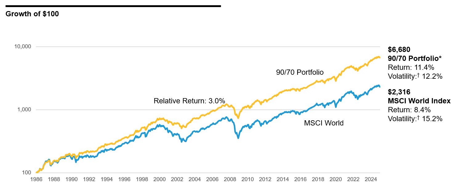 Data from March 31, 1986 (inception date of MSCI World Index) through March 31, 2025