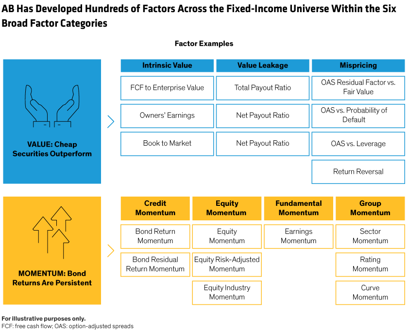 AB’s approach to investing using systematic techniques seeks to outperform bond market benchmarks principally through individual security selection. We aim to rank the securities in a benchmark to identify outperformance (alpha) potential, using an array of data-driven predictive characteristics, such as valuation, momentum or sentiment (Display).