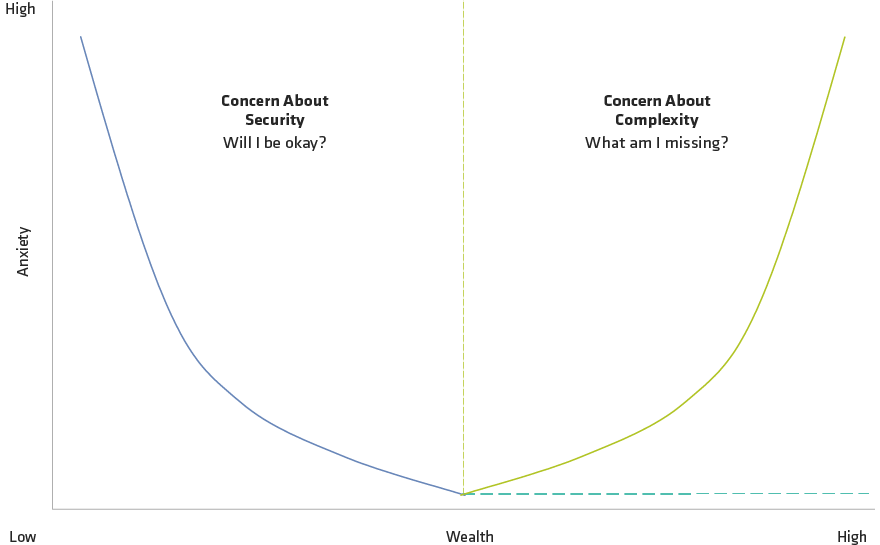I like to think about age and wealth in relation to anxiety or distress. Research shows that pain is nearly three times more motivating than pleasure. That means people are significantly more motivated to reduce or avoid pain than they are to achieve pleasure. This insight helps us understand how to give clients what they really need: more than just helping them achieve pleasure, like making more money or increasing the value of their portfolios, the simple answers, we should consider what pain our clients are hoping to avoid.