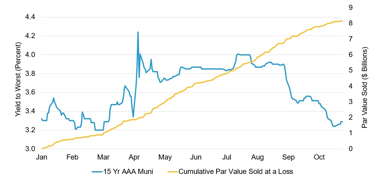 - Since the beginning of August, muni yields have dropped by 69 basis points and were at 3.29% as of October 31. That strong rally boosted muni bond prices and erased nearly all tax-loss harvesting opportunities for the year.